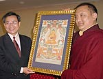 法王以釋迦牟尼佛唐卡贈與許市長。市長則以一幅美麗的台南景物畫回禮。在和諧的氣氛中,圓滿這場夏瑪巴法王錫台的第四場官方拜會活動。 |