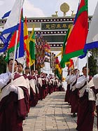 擁護法王的金黃色瓔珞傘蓋雍容緩行,仁波切率眾前導,浩浩蕩蕩,五色大旗迎風翻飛,繽紛絢爛的幢幡魚貫而列。夾道則有數百名來自全省各地的弟子信眾,或合十、或手持玫瑰,恭迎聖駕,人潮蜿蜒數百公尺。就連路旁樹蔭下拄著柺杖的老婆婆,一聽法王是阿彌陀佛化身,連忙趨前供養致敬,一臉滿足歡喜哩! 就這樣,我們追隨法王、仁波切身後,亦步亦趨,誠願循聖者足跡,邁向覺悟之道。