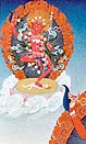 藏傳佛教「四部密續」中,「金剛亥母密續」,屬於四部密續中最高深的「無上瑜珈密續」。「無上瑜珈密續」又可細分成「父續」、「母續」、「無二密續」三個部份。「金剛亥母密續」屬於母續之精髓。 金剛亥母被譽為「諸佛之母」、「一切智慧之母」,為噶瑪噶居傳承最重要的本尊之一;許多高深的法教,例如大手印、那洛六法,都必須以觀修亥母為基礎。(詳見「洛本仁波切說」之「我的上師」) 唐卡中央是主尊金剛亥母,身相宛如二八妙齡女郎,一面二臂身裸、紅色、舞立姿,右足彎曲懸空,左足踩踏在蓮花日輪屍體上,全身綻放紅光,遍照十方三世。其裸身表示不受世俗污染,心不生分別。棕色頭髮上衝,頭戴五骷髏冠,頭部側面有一個豬形頭,因為豬屬於亥時,所以稱為亥母。右手高舉金剛鉞刀,左手持著盛滿鮮血的「噶巴拉」(顱器)於胸前,左肩內擁著嚴飾金剛杵和三個人頭的天杖。顰眉、三眼圓睜,獠牙緊咬著下唇,纖腰嬝娜,雙乳豐圓,曲線曼妙玲瓏。胸前、手腕、手肘、腰間、腳踝,佩飾人骨瓔珞。頸項至胸前垂掛五十個新鮮頭顱為鬘飾,綴以花朵和鈴鐺。雙圈背光,內圈藍色,外圈作紅色烈焰圍繞。如是圖像,內蘊珍貴秘密的佛理奧義。 上方是藍色不動佛,下方是我噶瑪噶居主要護法,二臂瑪哈噶拉大黑天。畫面右下角、左下角、左上角、右上角,依序是東南西北四方空行母:東方屬「金剛部」,空行母身藍色,金剛鉞刀以金剛杵嚴飾;南方屬「寶部」,空行母身黃色,金剛鉞刀以摩尼寶嚴飾;西方屬「蓮花部」,空行母身紅色,金剛鉞刀以蓮花嚴飾;北方空行母屬「事業部」,空行母身綠色,金剛鉞刀以寶劍嚴飾。其餘身像與主尊無異,凡此皆為金剛亥母的眷屬。 整體構圖以主尊為核心,上下左右對稱,呈現簡約和諧之美。其餘空間,則以山、樹、牟尼寶、珊瑚、象牙、噶巴拉、海螺……等等為裝飾。 本尊唐卡所描述的,不僅是一幅畫,更是一種觀想的意境。佛說:心為工匠師,能畫種種圖。凡夫心不淨,故呈現雜染紛亂的意識流。若將雜染不淨的念,轉化為本尊身相的清淨觀,是心即是佛心。這個特殊的轉化觀照,其實展現在唐卡廣為藏人所熟悉,如此,唐卡就不只是一張畫,而是一種修法的觀想所依。