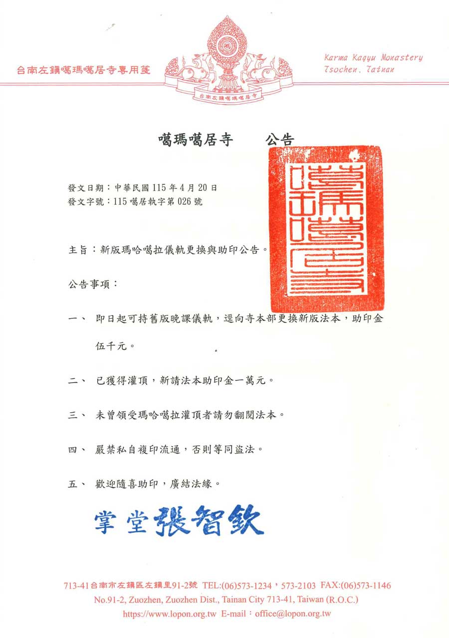 新版瑪哈噶拉儀軌更換與助印公告