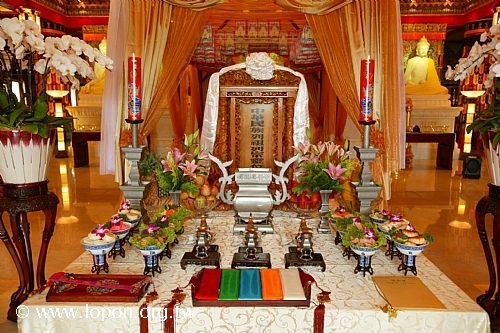 阿彌陀佛壇城前擺設各式供品