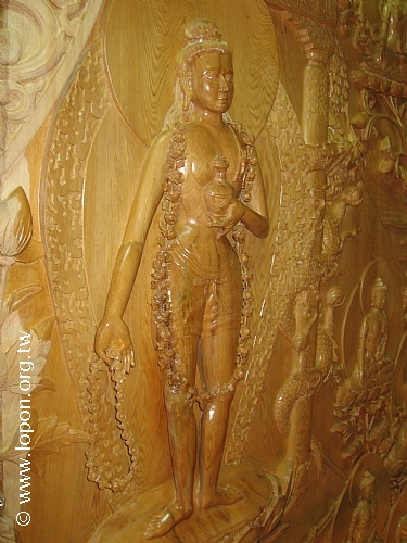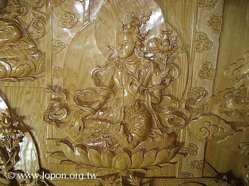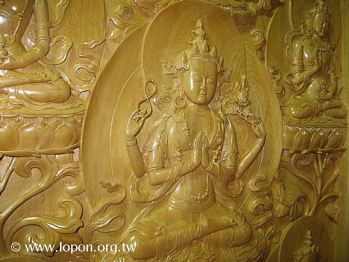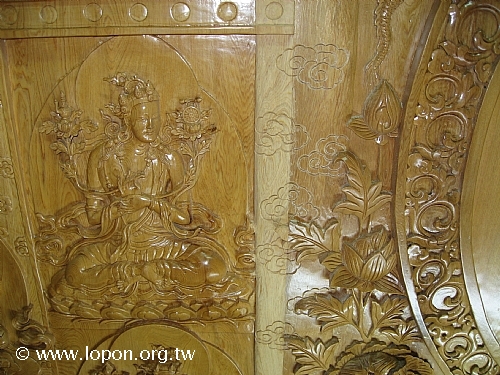 兩幅巨大的淨土木雕唐卡,分別以阿彌陀佛、千手觀音為主尊,主尊下方有蓮花池,可看到蓮花化生的景象。仔細一瞧,有的花苞微開,僅能見到人物的頭部,有的可以看見上半身,有的端坐在盛開的花瓣上,有的放出圓滿的頂光和背光,顯示雖然同樣是往生至淨土,但由於個人的修行成就與福慧資糧不同,蓮花化生的品地也隨之不同。