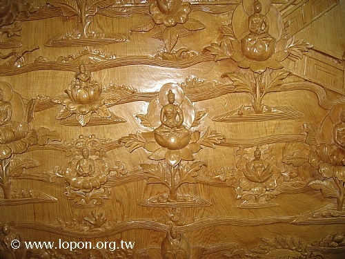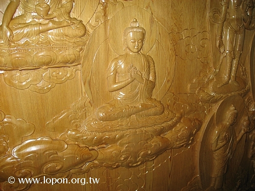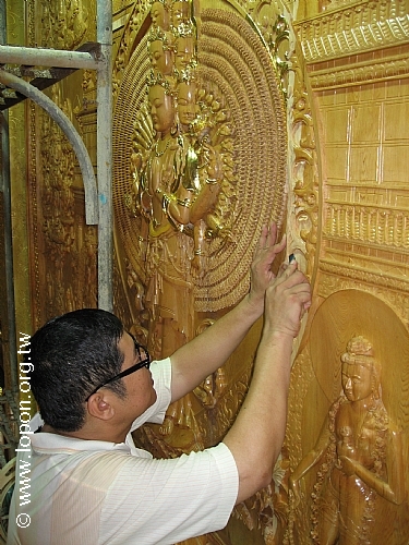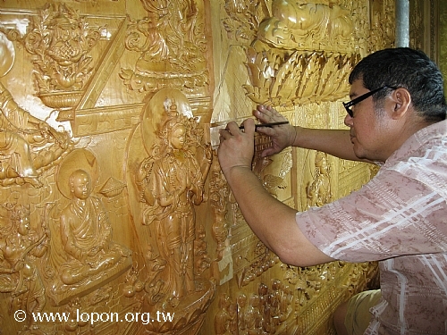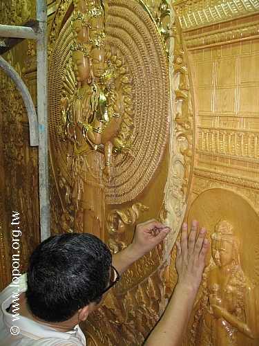 「阿彌陀佛淨土」與「觀世音淨土」兩件巨幅木雕,日前安裝完成。為了使銜接處達到天衣無縫的完美效果,木雕家王老師來到寺裡,在鷹架上進行精修。