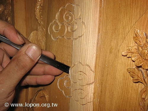 王老師說:「我一看到圖案,就知道要怎麼雕。根據西藏畫師的素描,有些圖案在前,有些在後,雕刻時必須刻出層次面,看起來才能自然又真實。如果有佛或菩薩坐在雲上,雲的圖案就要刻得立體,浮出畫面,看起來才能托住菩薩;反過來說,如果把雲刻得平坦或內凹,菩薩看起來就會坐不穩。」