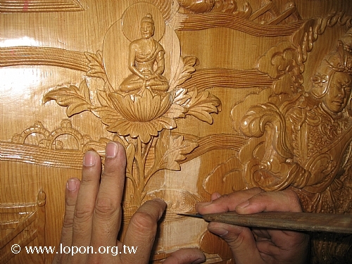 王老師不僅雕出浮凹有緻的作品,許多精細的地方,例如蓮花的莖葉、本尊手中的念珠、花蔓、身上的飄帶,以及宮殿樓閣的欄杆,均以鏤空的手法來雕刻,工藝之精,讓人嘆為觀止!同時也引人好奇,要如何判斷哪裡要刻成浮雕,哪裡要刻成凹紋,哪裡又可以鏤空呢?