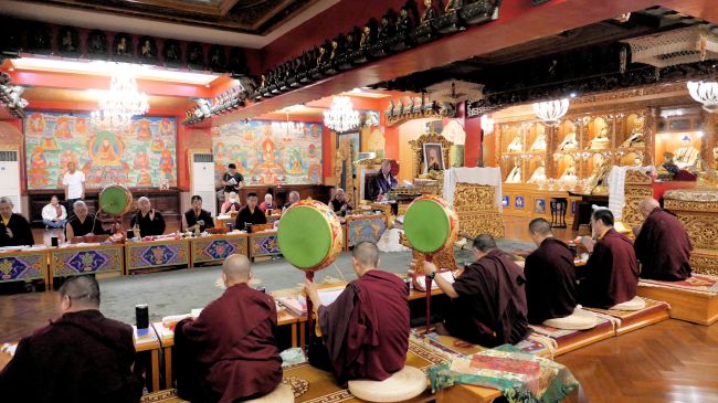 上師仁波切主法,與喇嘛們修持煙供儀軌,依此供養三寶三根本,能平息修行之違緣,消除不淨晦氣、疾病、魔障,令壽元福德祥瑞俱增長,世界和平安樂。