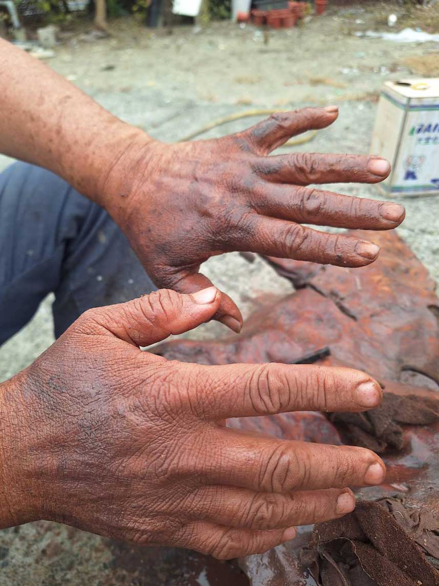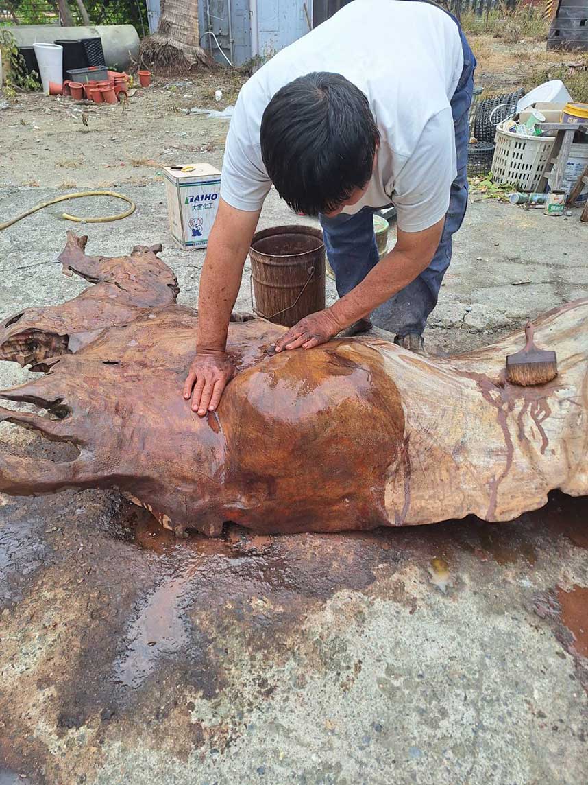 翁師傅先用藥劑刷過,讓舊漆退去;再用雙手仔仔細細地刷洗木頭的肌理;奇木原有的面目,乾乾淨淨地呈現!