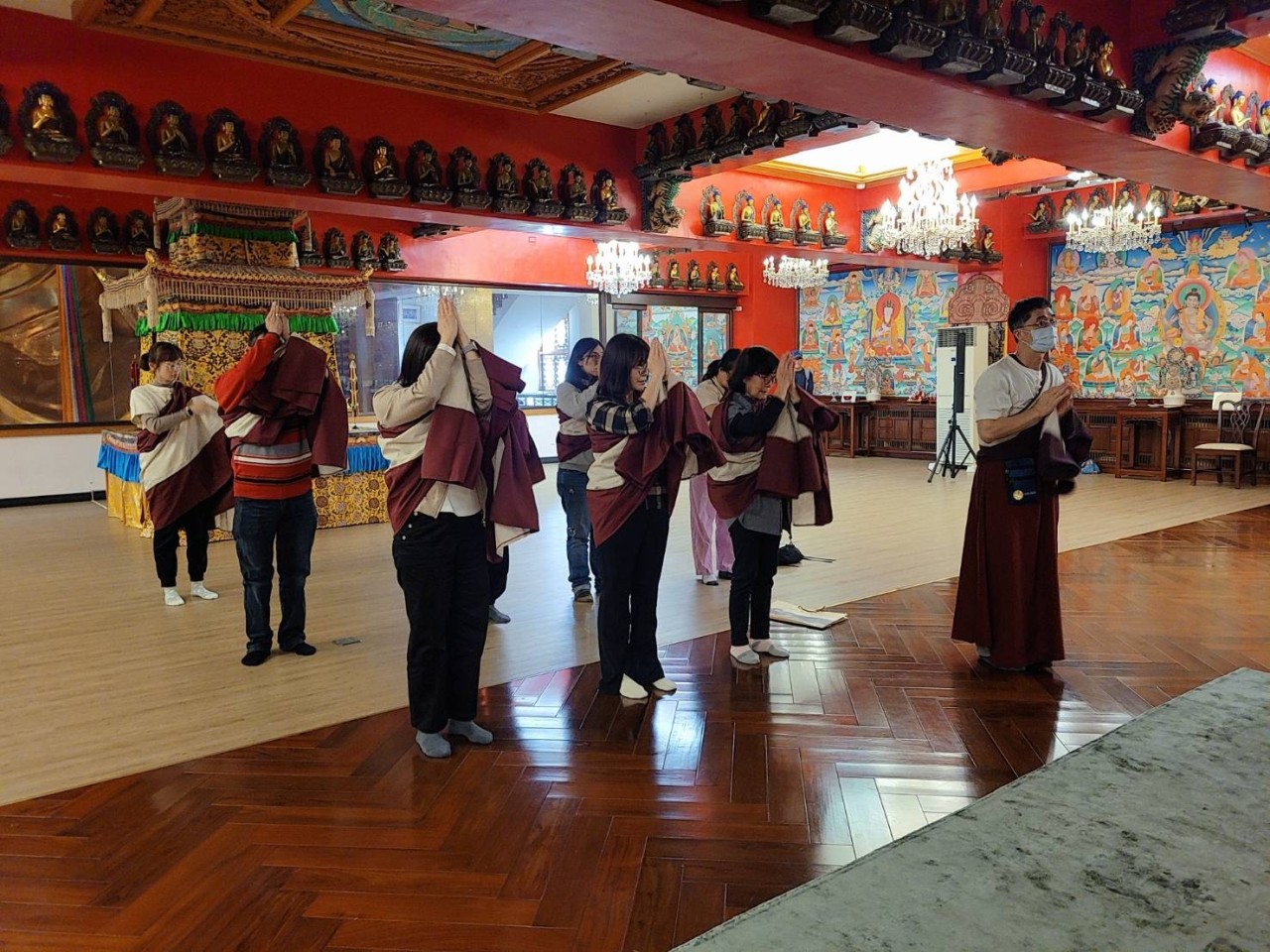 完成皈依儀式後,彤明師兄發心協助,耐心指導新皈依的師兄如何正確穿著法披,以及穿法披時的頂禮方式。大家神情專注、態度恭敬,一步一步認真學習,展現出對佛法的尊重與珍惜。
