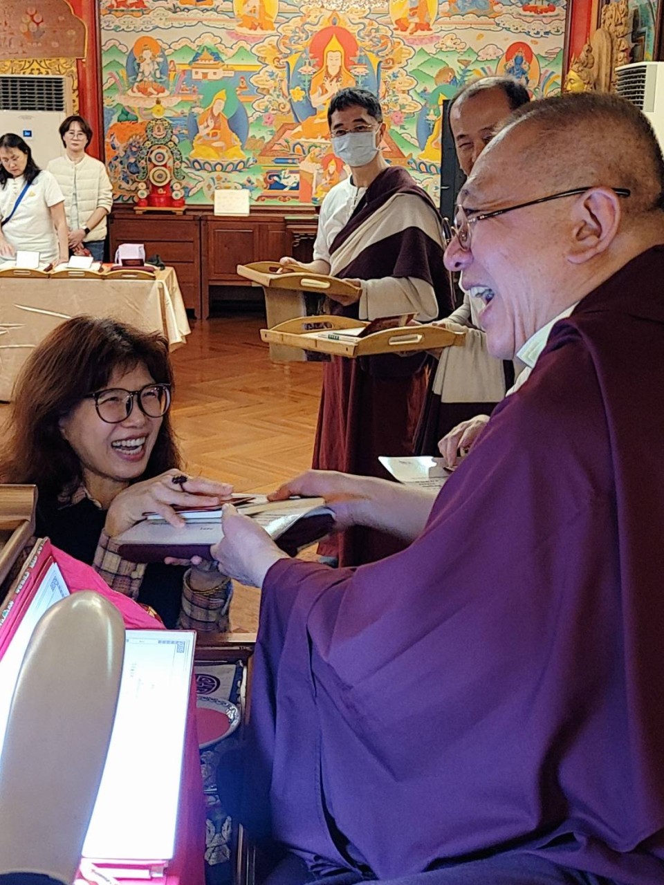 法會中, 上師慈悲親臨,親自教導新皈依者如何正確接領皈依證,並一一授予 上師所加持的皈依證書。整個過程細緻而莊嚴,不僅讓新皈依的師兄們受益匪淺,在旁觀禮的我們,也跟著重新複習皈依的初心與儀軌。當下道場中充滿寧靜與感動,人人臉上皆洋溢著法喜充滿的笑容。