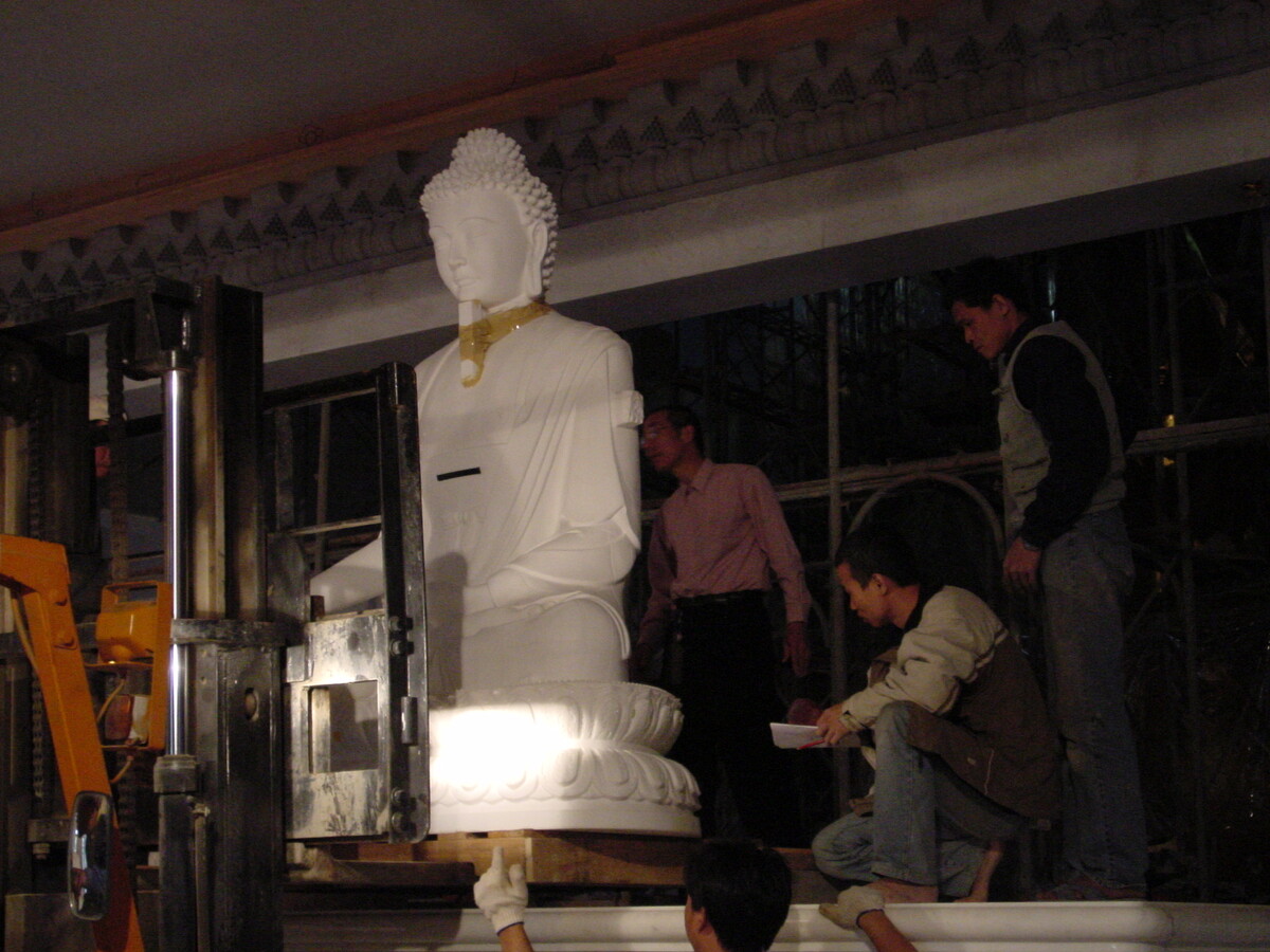 由於佛像極其沉重,一旦放下便無法再移動,且七佛相距僅數公分,放下後發現竟然已經毫無偏差的定位了!王老師提及往事,仁波切笑說:「七佛是自己跳上蓮座的!」