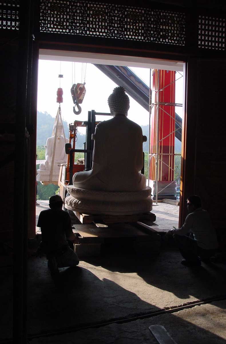 回想起當年的安座過程,王老師不禁莞爾。當時大殿已建成,巨大的石佛無法依靠吊車直接放入室內,只能將堆高機先吊入如來殿,架設斜坡跨過門檻,才能將七佛安座。