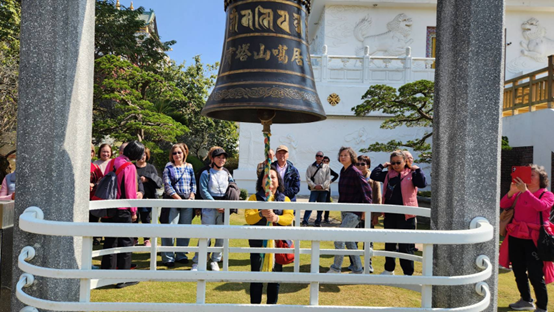在志工王貞惠師兄詳盡的導覽下,眾人細細品味這座歷經四十年、集結無數工藝大成的殿堂。當大家駐足於七佛座前,那莊嚴的法相不僅是藝術的結晶,更源自一段殊勝的禪修因緣。