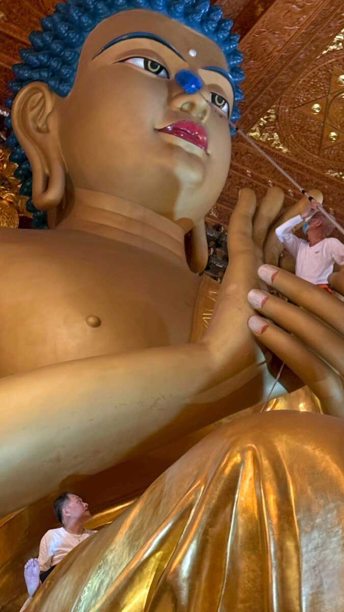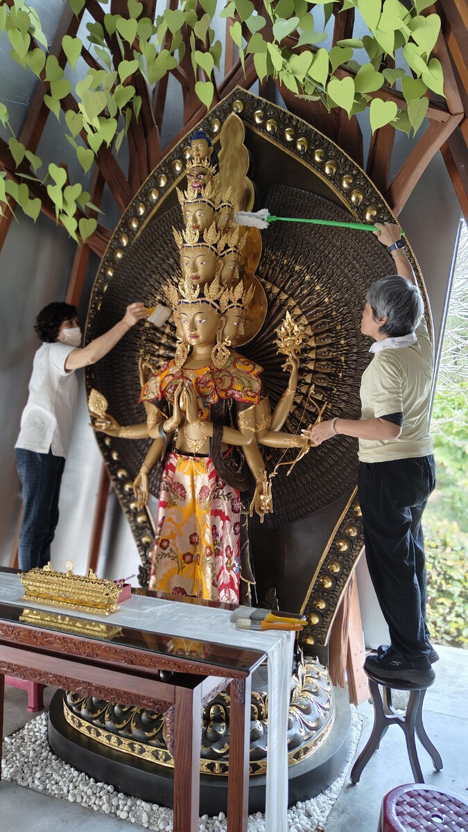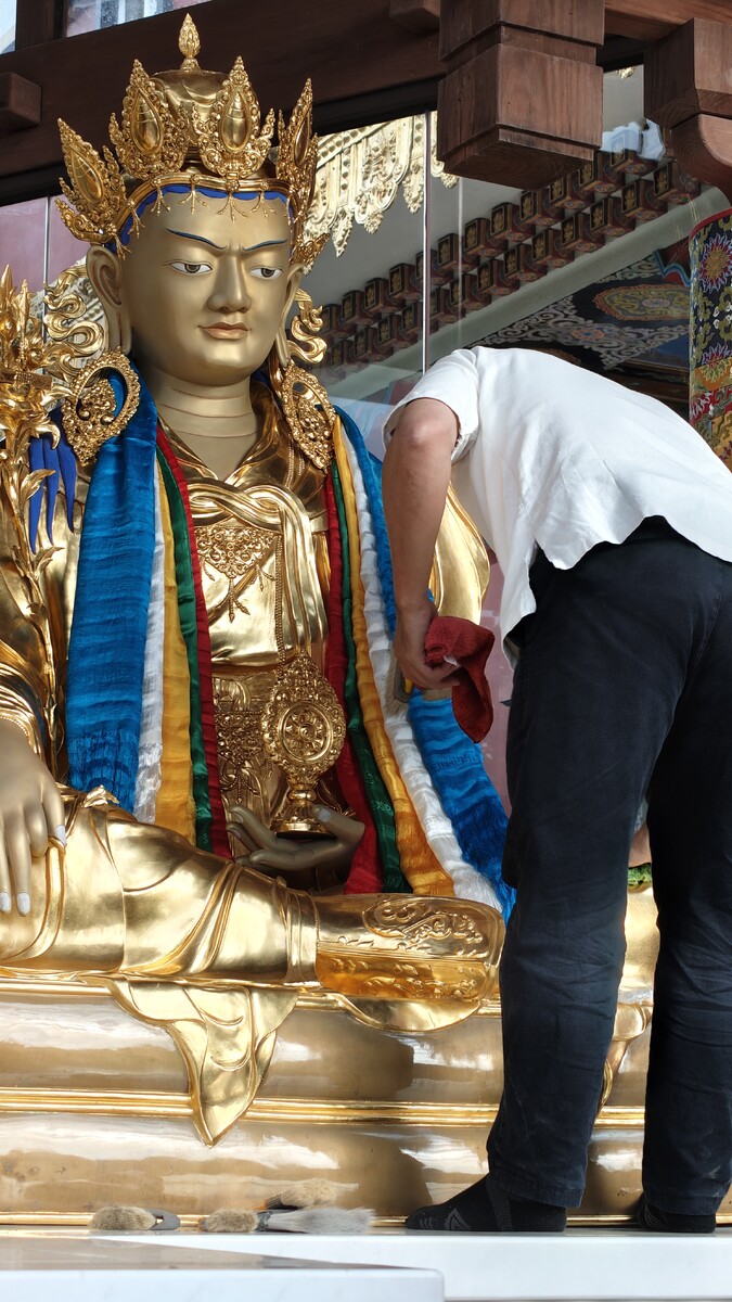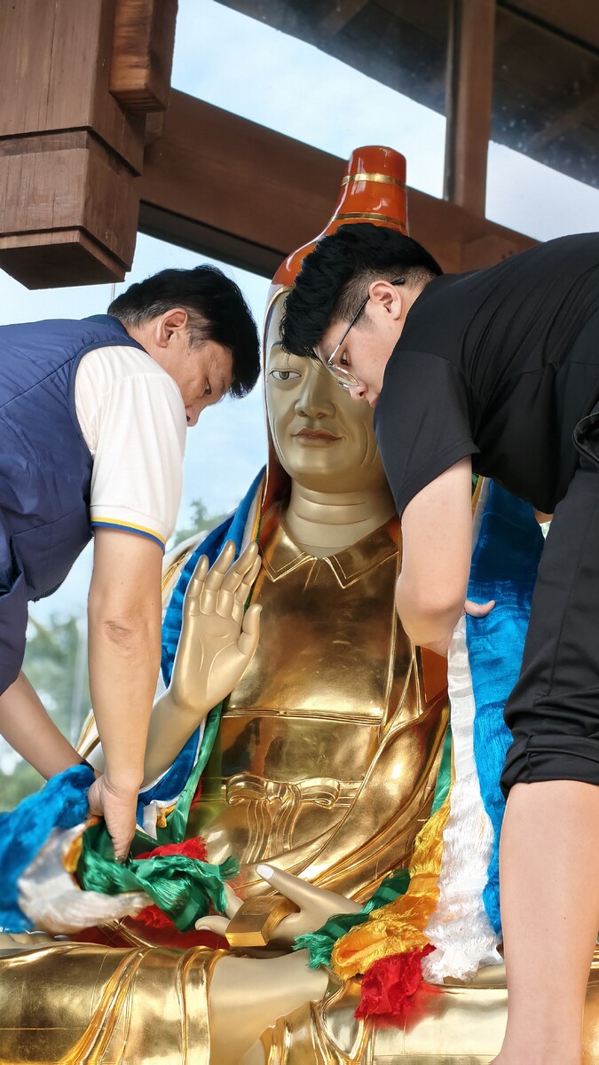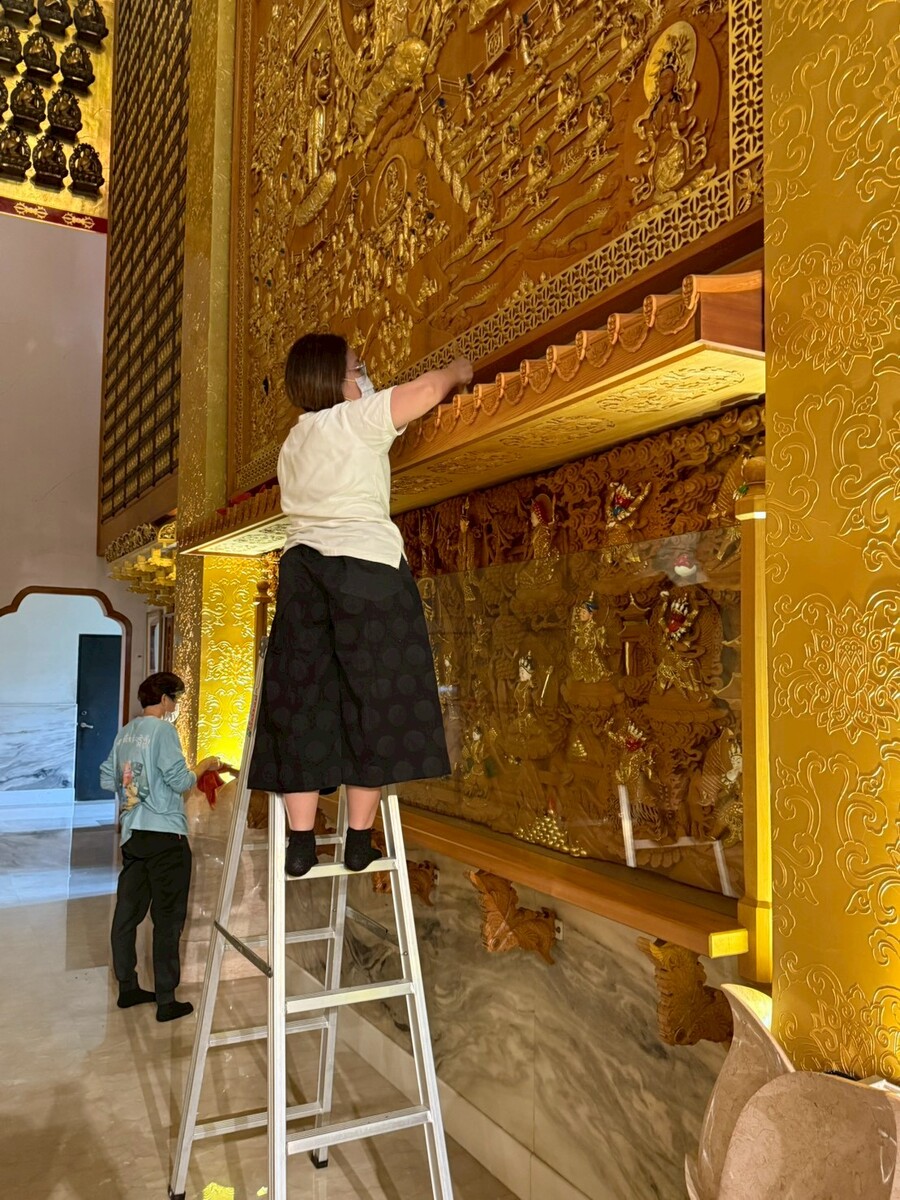 午後一時,眾人集結於如來殿七佛前,合掌一心,虔誠唱誦〈七支供養文〉。梵音落定後,嚴淨之典方正式開啟。師兄們脫去鞋履,攀上高座,或是執巾拭塵,或是洗滌金身。大佛慈眼垂視,眾人俯首承事。那佛身上的金光與人間的汗水交織在一起,正應了那句:「淨佛像,能生三世身常潔淨之功德。」這不僅是清掃灰塵,更是在滌蕩自心之垢染。