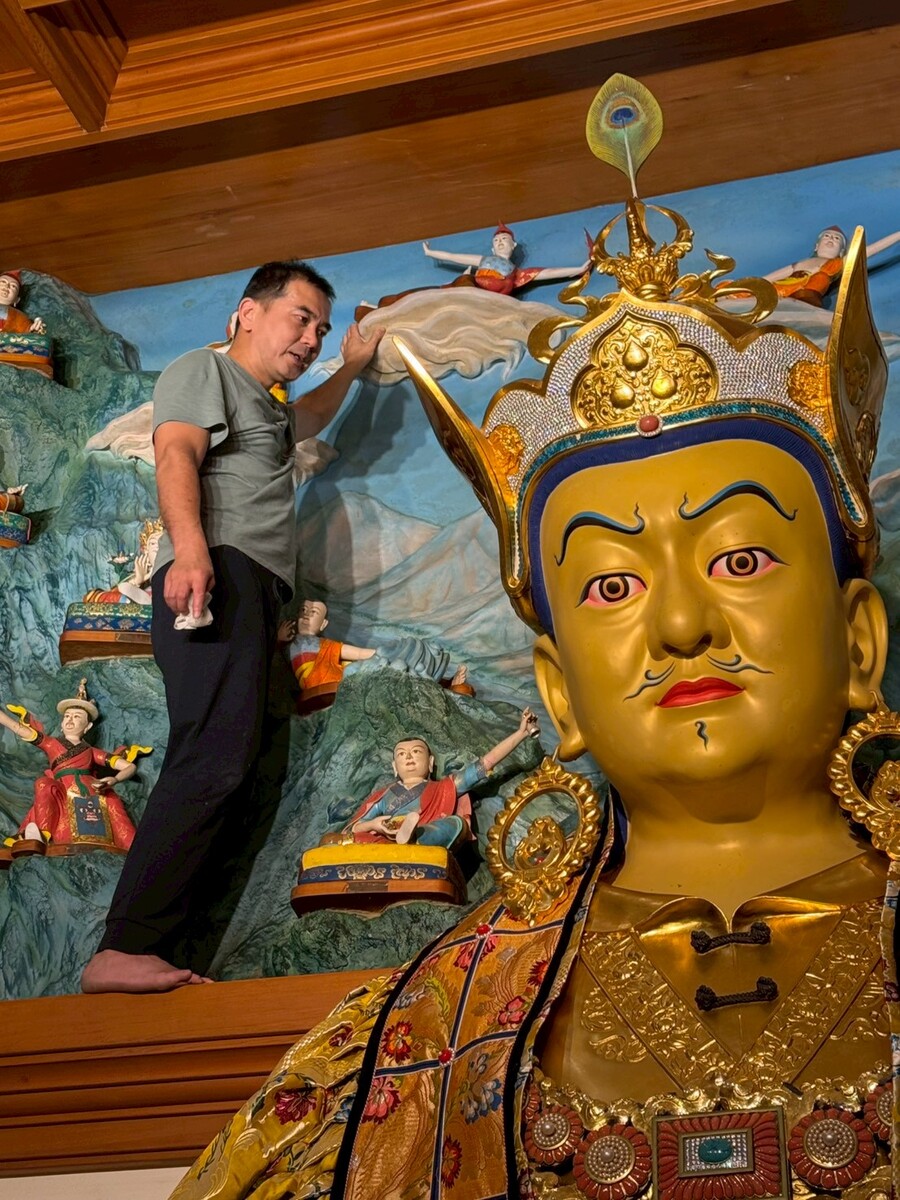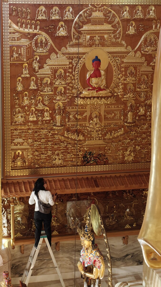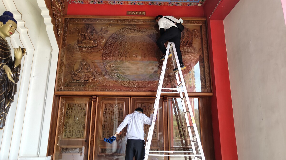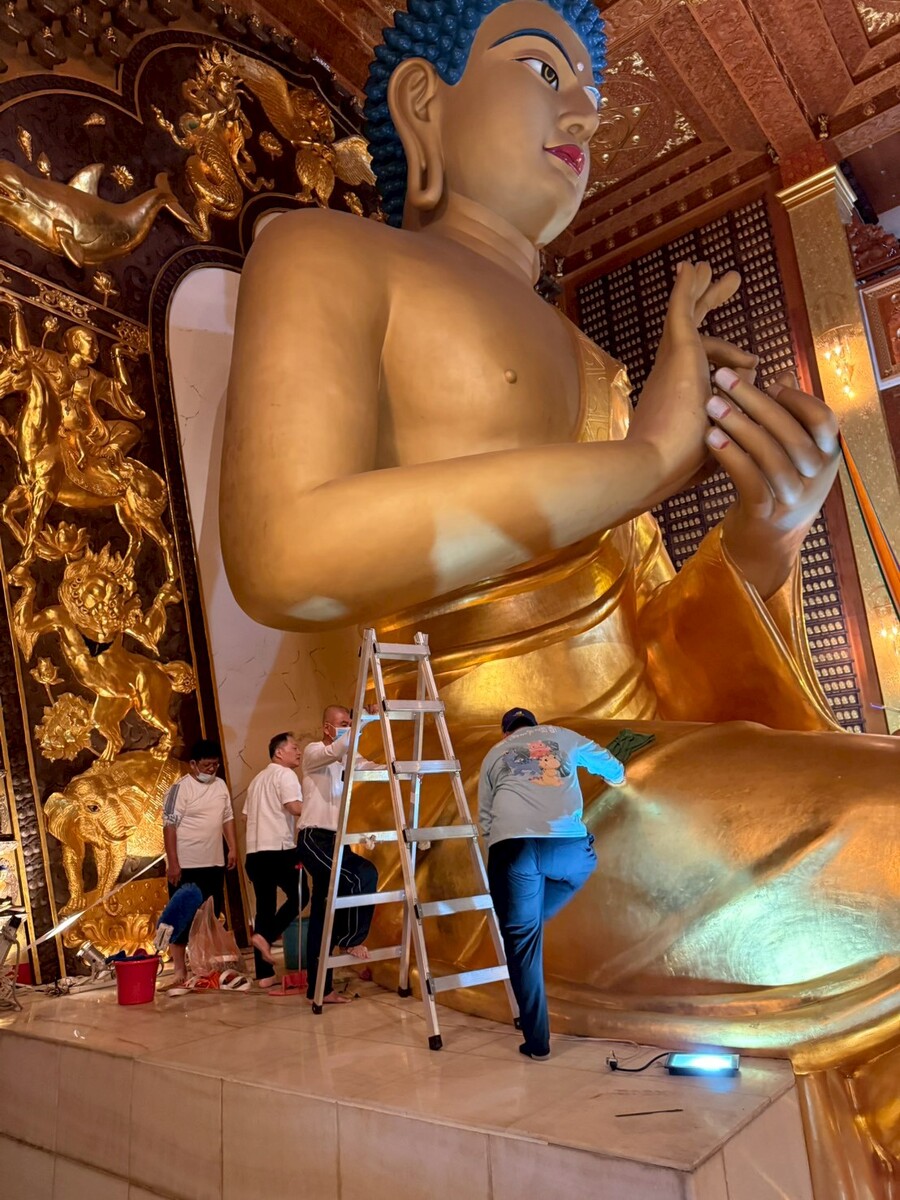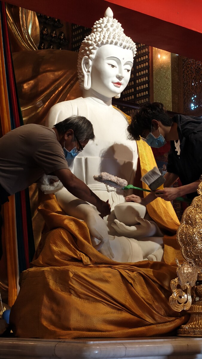 午後一時,眾人集結於如來殿七佛前,合掌一心,虔誠唱誦〈七支供養文〉。梵音落定後,嚴淨之典方正式開啟。師兄們脫去鞋履,攀上高座,或是執巾拭塵,或是洗滌金身。大佛慈眼垂視,眾人俯首承事。那佛身上的金光與人間的汗水交織在一起,正應了那句:「淨佛像,能生三世身常潔淨之功德。」這不僅是清掃灰塵,更是在滌蕩自心之垢染。