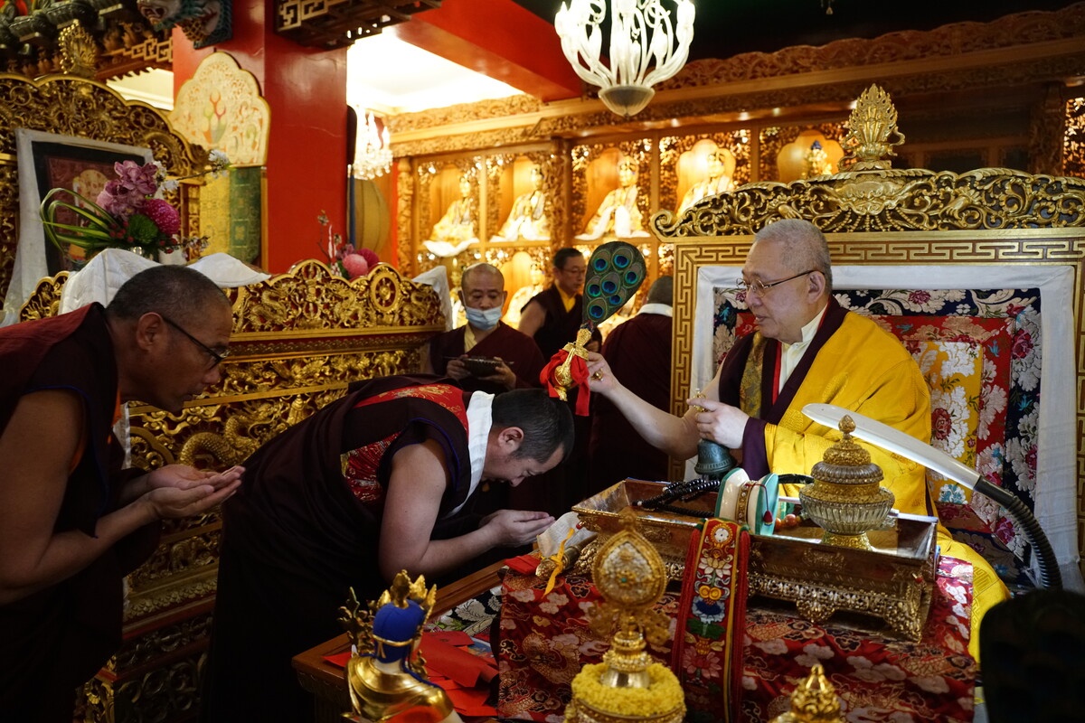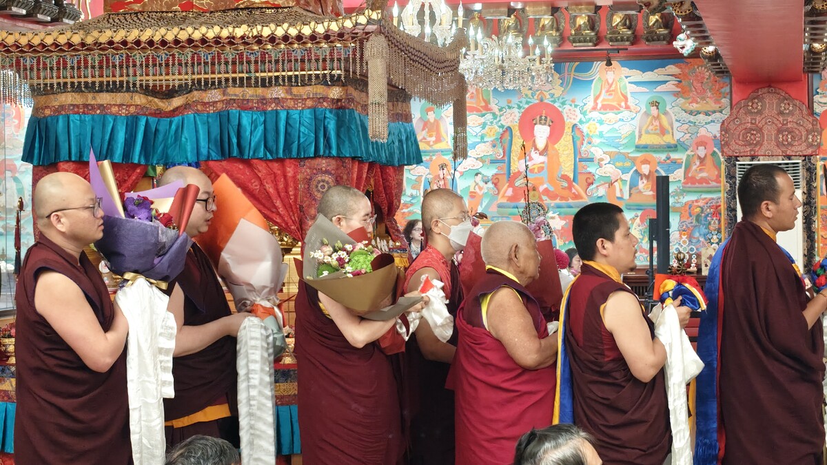 霏霏細雨潤澤萬物,是初春自然的景象(是的,法會第一天很祥瑞,陽光普照),微冷。報到時,寺方貼心為與會者別上別緻的胸花,紅色玫瑰襯著臉上的笑靨,真是個歡喜的開場。迎師的法樂吹響,金剛昆仲雀躍的言笑宴宴如散花落盡, 上師踩著自在的步伐,泰然登上法座。隆德寺的僧團代表恭敬如法地向尊貴的赤巴獻曼達;四大部洲、八小部洲,環繞著中央須彌山,一切人天悅意的美好,都在曼達盤的黃金地基上漸漸隆高,三十七供將佛子的虔敬淋漓呈獻。緊接著,僧團魚貫向 家師敬獻身、語、意、功德、事業供養;長壽佛像、法本、舍利塔,還有十字金剛杵……,堪布、喇嘛們將手中的聖物以純白卡達依序敬獻。
