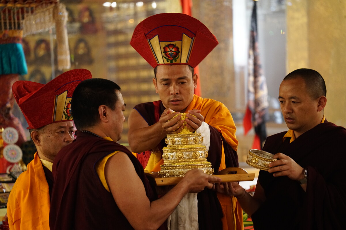 隆德寺喇嘛向 上師仁波切獻曼達與身口意事業功德供養,有如法王錫臺時, 上師仁波切向 噶瑪巴獻供一般。堪布解釋「固松圖སྐུ་གསུང་ཐུགས།」――敬獻身、語、意、功德、事業之所依: