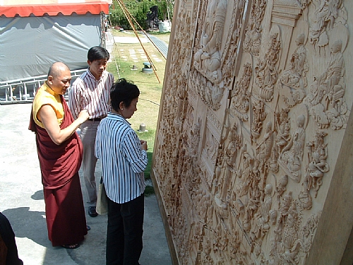 阿彌陀佛淨土的木雕唐卡已經雕刻完成,刻工細膩、構圖對襯,加上宏偉宮殿的烘托,流露著木雕莊嚴和諧之美,後續尚須安金,使作品更加莊嚴。貴賓們站在木雕唐卡之前,主尊阿彌陀佛正好位於頭頂上方,整幅作品寬360公分,高390公分,規模甚大,因此分成三堵木塊來雕刻。