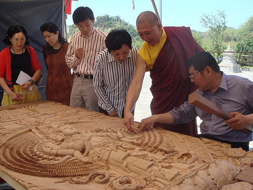 導師說:「本來今天是請處長來指導,處長表示這麼好的東西,要讓更多人分享。東方的佛寺已成為藝術殿堂。台灣各方面都進步了,對文化的重視也有提升。藏傳佛教來台灣落地生根,為了推動藏密本土化,我將深奧的教義以最簡單的元素呈現出來。木雕在台灣並不稀奇,台灣有最好的工藝師,有最好的檜木。特別的是,我們將唐卡化為木雕藝術。每一堵木雕都經過許多時間才完成,將平面的唐卡立體化,保留在台灣島上,成為這塊土地的文化資產。」