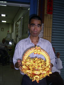金元寶花籃,以大悲咒鬘真言紙為紙材,由街友手工精摺而成。街友摺紙時心神專注不放逸,口中念誦六字大明真言,是 滇真導師慈悲,讓這群無家可歸的可憐人,在心中種下菩提種子。