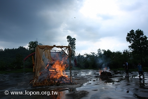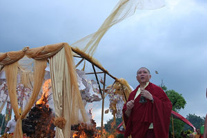 超薦法會的最後儀程,在儀仗隊伍前導及金剛護法護送下,迎請法帳與蓮位至廣場火化台, 上師親臨超渡火化,引三昧真火點燃牌位,並以灑米加持亡靈及寶瓶水清淨亡靈的業障,拔渡先人之靈歸往西方極樂淨土。此時,艷陽穿透雲層,灑下九重金光。