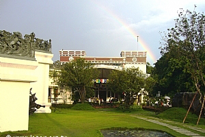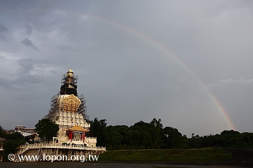 三壇超薦渡亡法會圓滿之際,斜陽從厚厚的雲隙中穿透出來,放射出和煦的金光,和著小雨稀稀疏疏落在大地上;一道彩虹跨在天上,像是象徵三壇超薦大法會的圓滿。 |