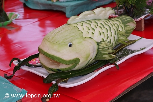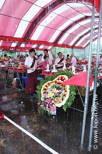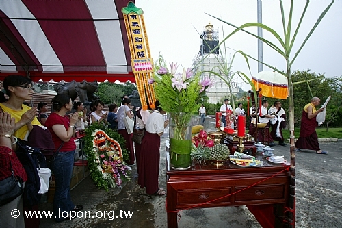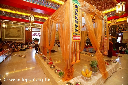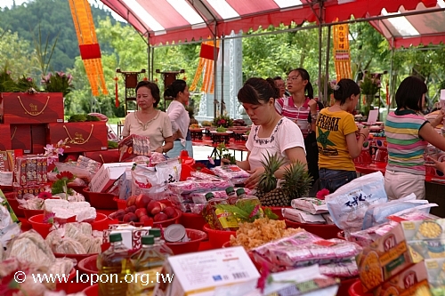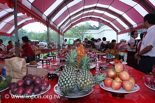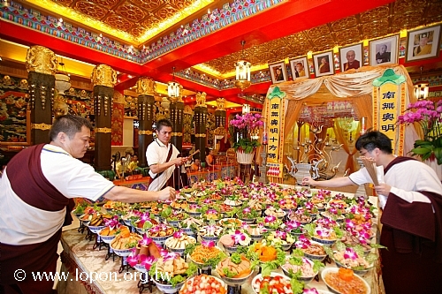 清早八時,艷陽高照,已有許多師兄來回穿梭於法王殿廣場,忙著普渡會場的佈置與供品擺設,執事會與各道場精心籌備百味佳餚,一應俱全。台南馬爾巴道場設計一系列「龍飛」、「鳳舞」、「八吉祥」等果雕盛宴,最為搶眼出眾,高雄那洛巴道場的彩繪供盆與「滇真摩尼寶」更是一絕,噶居弟子匠心獨具的巧思,可以深深感受到祭拜先人與冤親債主亡靈的虔敬心。