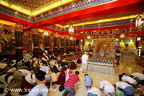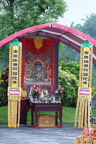 阿彌陀佛聖像進入法王殿廣場,信眾合十敬禮。 阿彌陀佛聖像安座 |