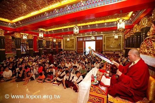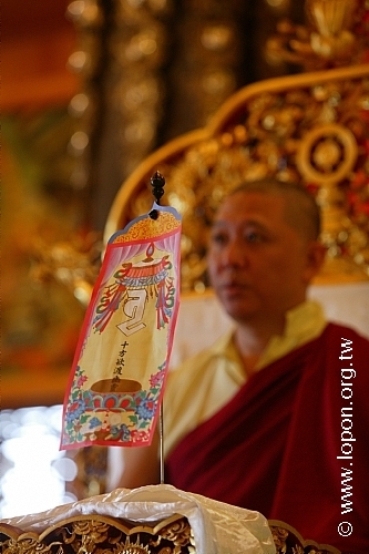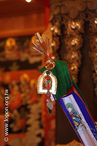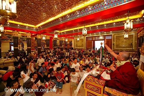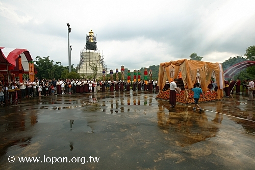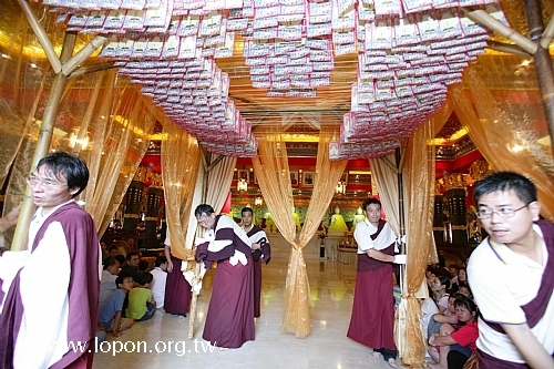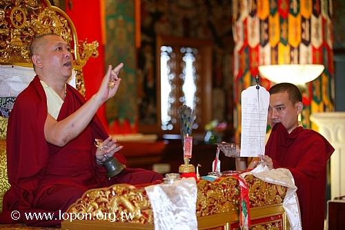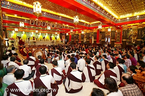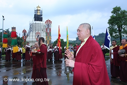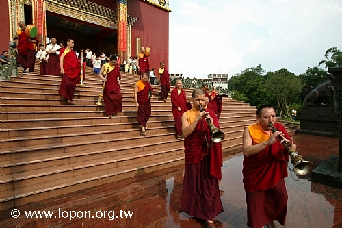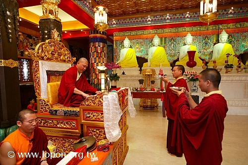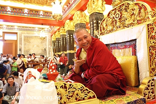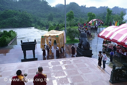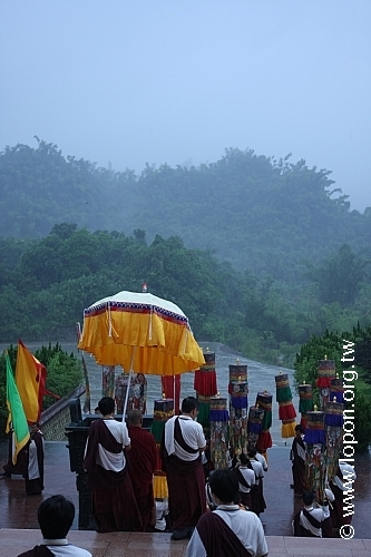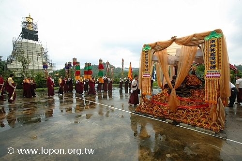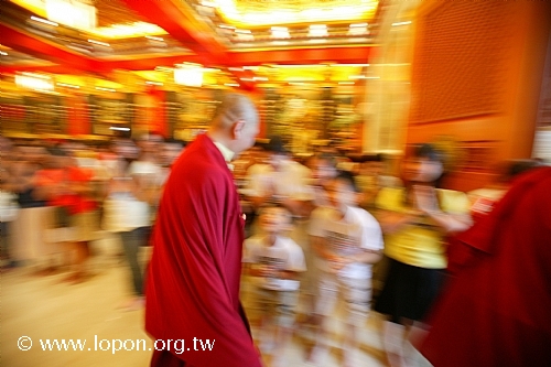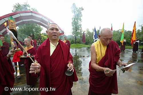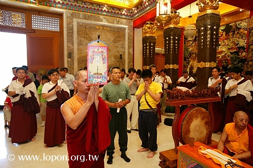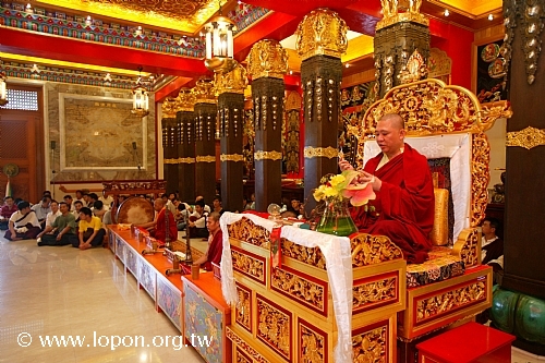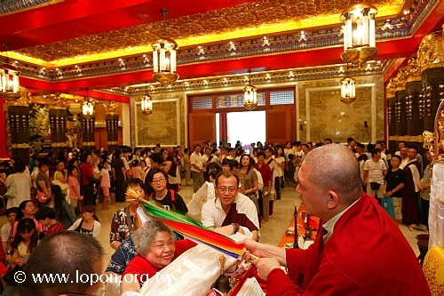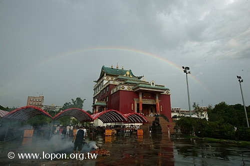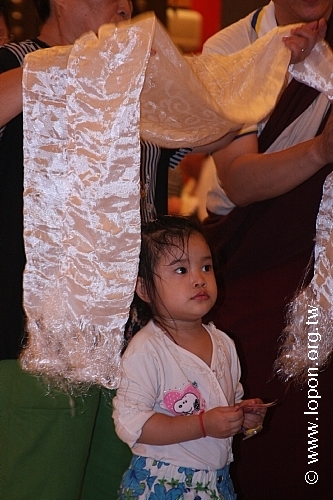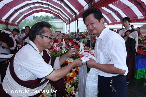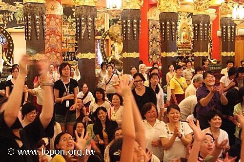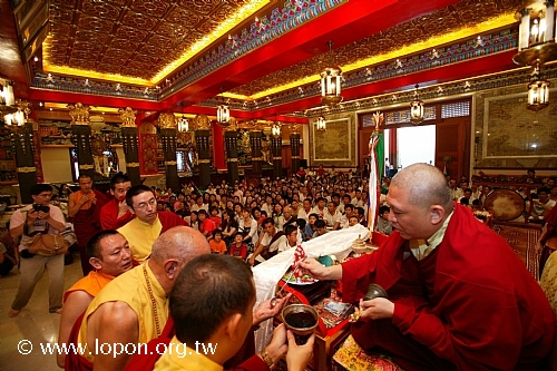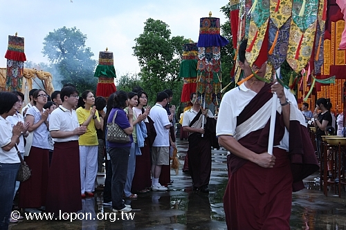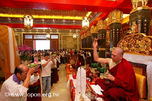 火化蓮位之後, 導師返回法王殿,以長壽加持弟子。弟子們向 導師獻卡達,領受長壽加持與甘露。殿外雨勢乍起,一片霧靄靄、灰茫茫的景色,卻絲毫不影響殿內熱烈而興奮的情緒。