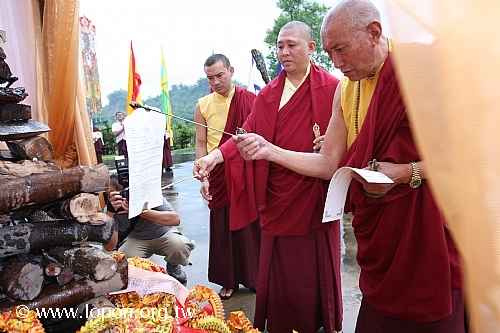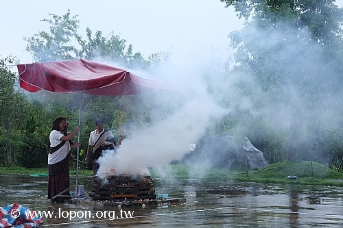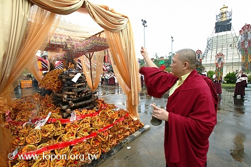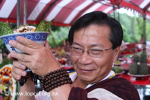 在普渡祭拜同時,法王殿內由 上師登座帶領喇嘛修法渡亡,百餘名信眾弟子隨喜聞法。當 上師施食將百樣供品灑淨變現之後,殿外風雨恰好停歇,讓信眾們依序捧著供品,送往廣場上的煙供台,藉此焚燒百味美食化為白煙,供養祖先亡靈與孤魂野鬼。