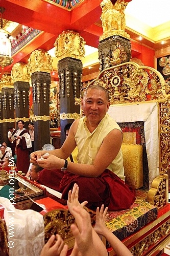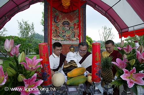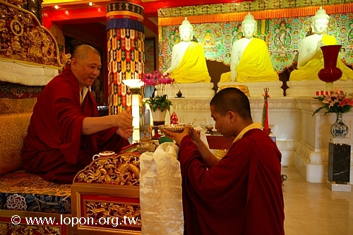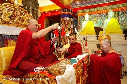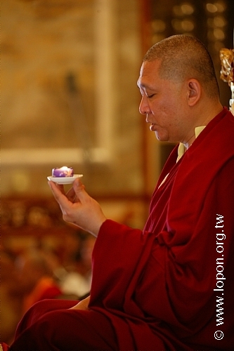 薈供修法之後,喇嘛向 導師敬獻供品 導師取用長壽甘露