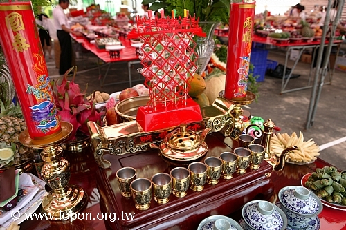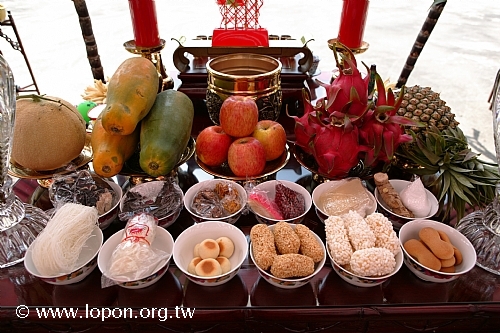 每一路普渡宴最前方設有香案,供養香、燭、茶、酒…… 香案的另一方供養水果與乾果