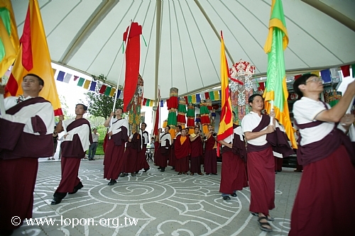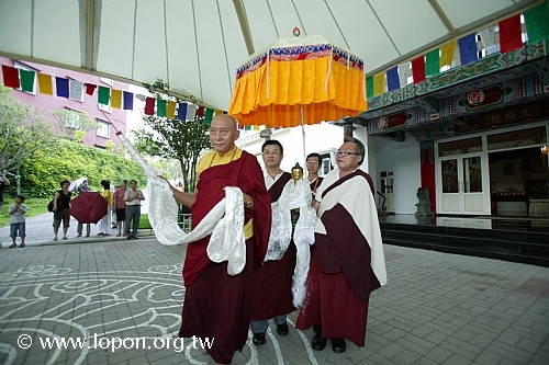 迎請儀仗從文殊院出發 喇嘛以香棒、卡達為前導,本寺執事迎請阿彌陀佛聖像。