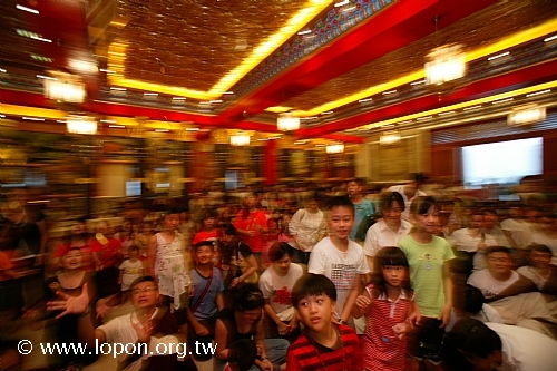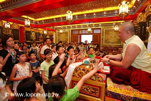 導師每擲一把錢幣,現場紛紛發出興奮的呼喊聲,當 導師拿起千元大鈔,眾人的情緒更是推升到最高點,希望能獲得這絕佳的大好機會。一群小孩為了搶奪最佳的位置,紛紛站起身來將 導師團團包圍, 導師還必須稍稍起身,朝前奮力一擲,才能將補運金拋到較遠的地方。有的小孩還爬到法座上,倚著 導師的肩膀不斷高喊「我也要、我也要」。面對這數十隻揮舞的小手, 導師不禁笑著說:「小孩子要那麼多錢做什麼呢?」雖是這樣說,但立刻又拿了一大把朝他們丟去,小孩們興奮地尖叫出聲,場面十分溫馨有趣。