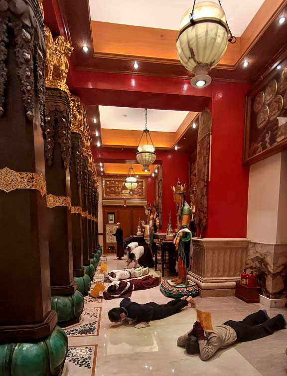八、請著居士法袍為莊嚴。備寬鬆休閒長褲,以利大禮拜。為利盤腿可自備使用小座墊。
