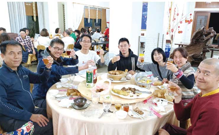 大黑尊者還天地以清淨本然,微笑阿彌陀佛巍然寂止;除夕夜, 上師與金剛昆仲圍爐共度,迎接嶄新鮮活的新年。飯後歡喜搓湯圓,大人小孩展歡顏。