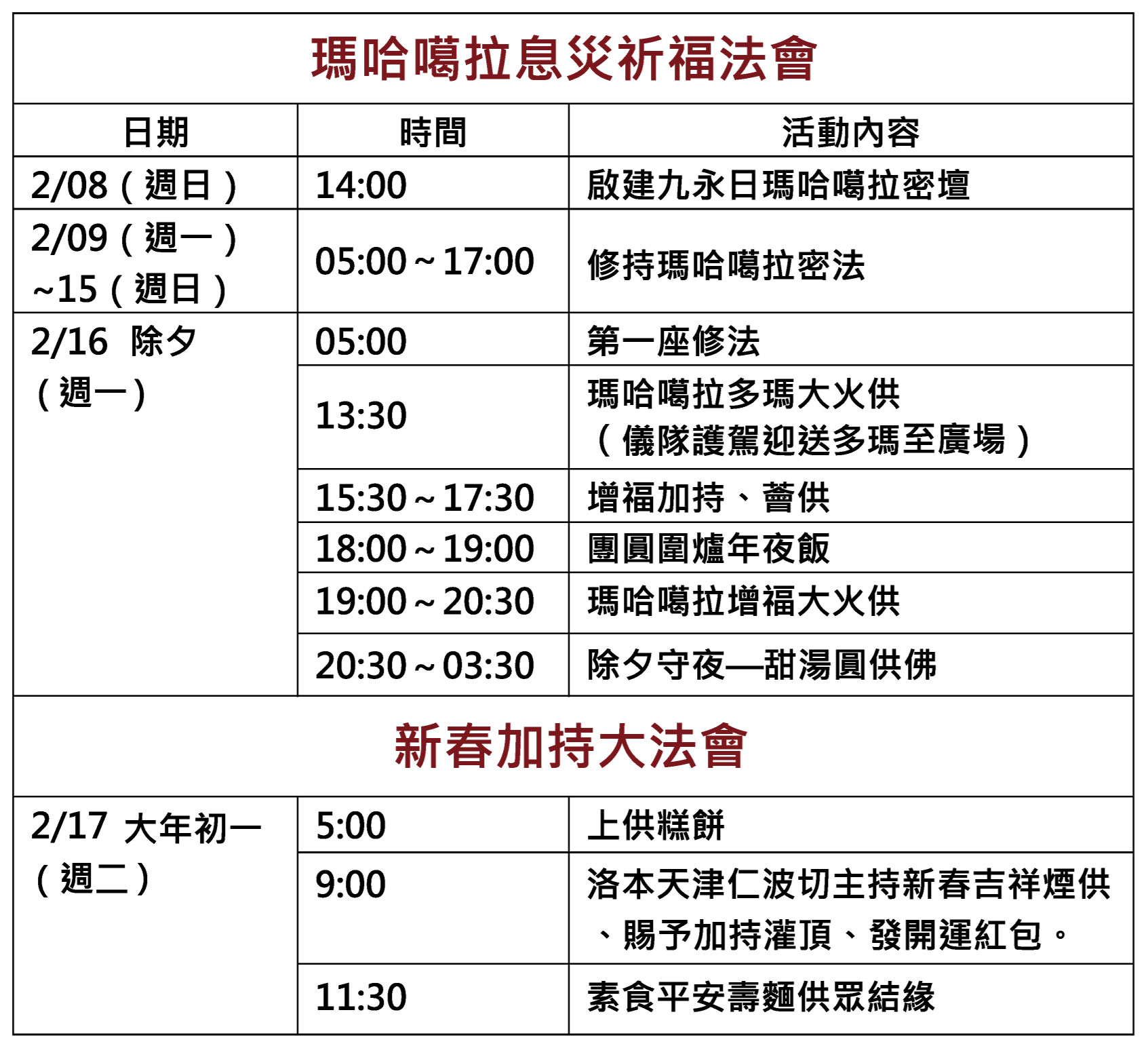 乙巳木蛇歲末,為求國祚綿延、兩岸和平、社會安定、人民安居樂業,本寺謹訂於國曆二月八日至二月十七日,一連九天,啟建護法大黑天瑪哈噶拉密壇,盛大舉行「瑪哈噶拉息災祈福法會」;二月十七日大年初一圓滿日,同時隆重舉行「新春加持大法會」。恭請尊貴的噶居赤巴 洛本天津仁波切主法。