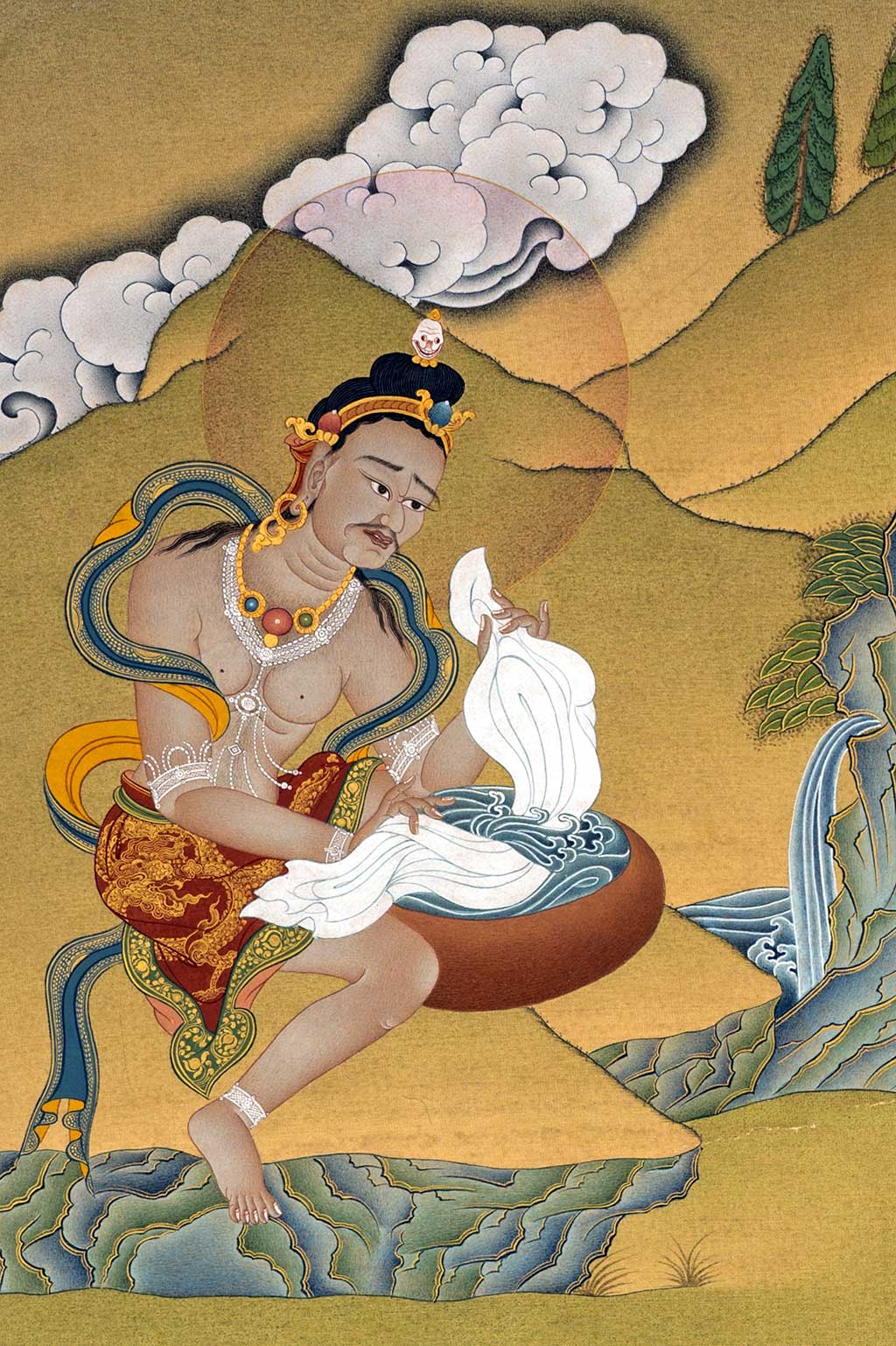 在薩利鋪札城中,住著一對洗衣工階級的父子,平日便靠洗衣維生。一天,一位具德的瑜珈士化緣經過,在供養瑜珈士之後,父子兩人請求為他洗衣,瑜珈士便拿了塊木炭,問他們:「你們能將這木炭清洗乾淨嗎?」兒子回答:「木炭的本質是黑色,即使刷洗它也無法將它變成白色。」瑜珈士便說:「所以,你洗的也只是外表而已,如果我不清淨內在三毒的染污,光是穿著外表乾淨的衣服,是沒有益處的。你必須多次刷洗才能維持東西的乾淨,然而我的教法只需清淨一次就有效用,你們需不需要呢?」父子倆便回答:「我們的確需要。」