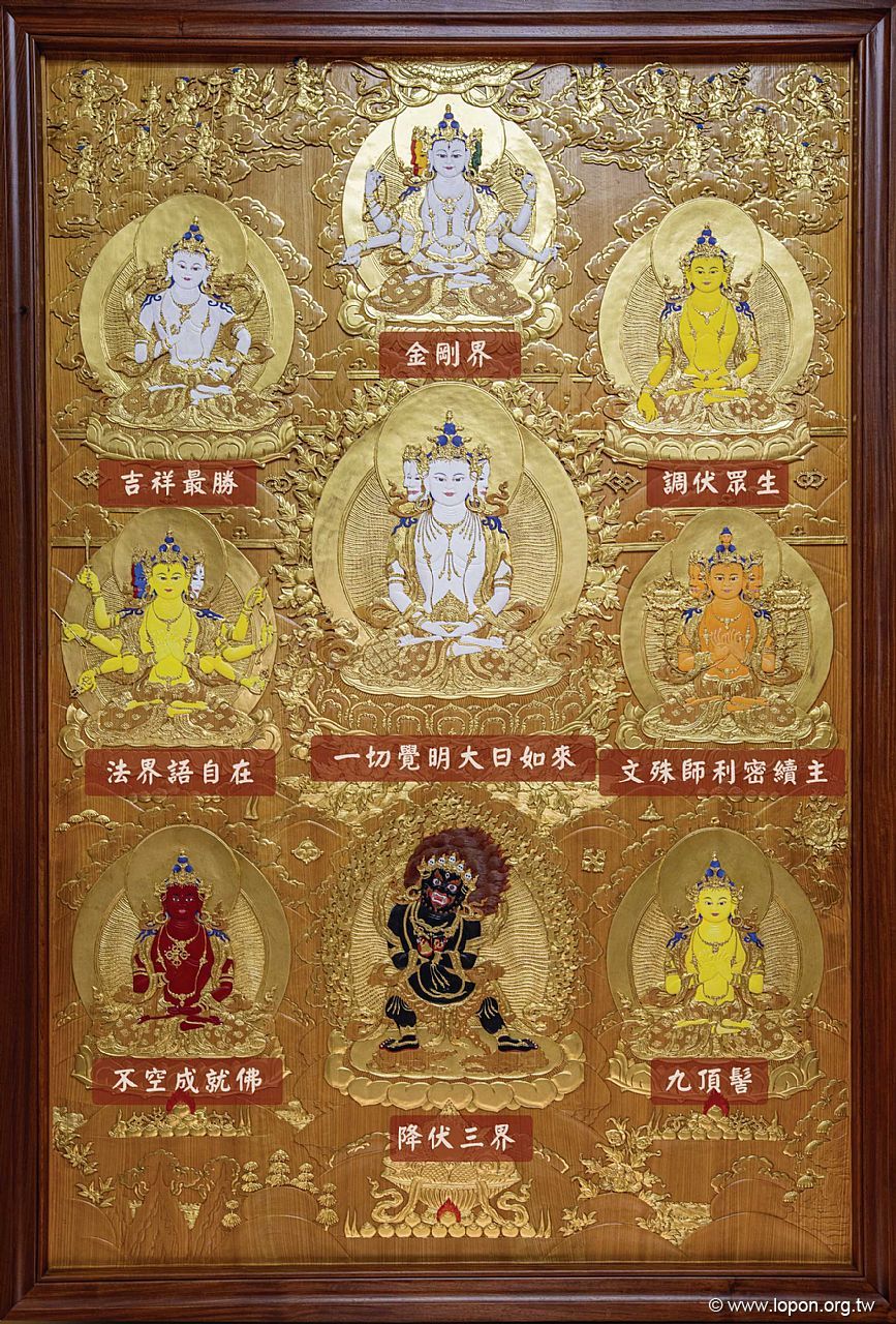 一切覺明大日如來(藏文譯音:袞利南巴囊則)、降伏三界(康順南嘉)、不空成就佛(敦湯傑竹巴)、法界語自在(確英松旺)、吉祥最勝(巴秋唐波)、金剛界(多傑英)、調伏眾生(卓哇督瓦 )、文殊師利密續主(蔣巴桑殿)、九頂髻(祖固)