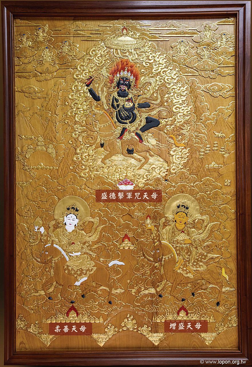 此佛屏中央,盛德擊軍咒天母(藏文譯音:巴殿瑪梭吉嘉莫),一面二臂三目,騎騾奔於血脂騰湧之海。右手持金剛杵杖,左捧盈血噶巴拉,上嚴孔雀翎傘蓋。頂髻月壇城、臍輪日壇城,穿黑絲綢披風,著虎皮裙,戴五十鮮顱瓔珞。