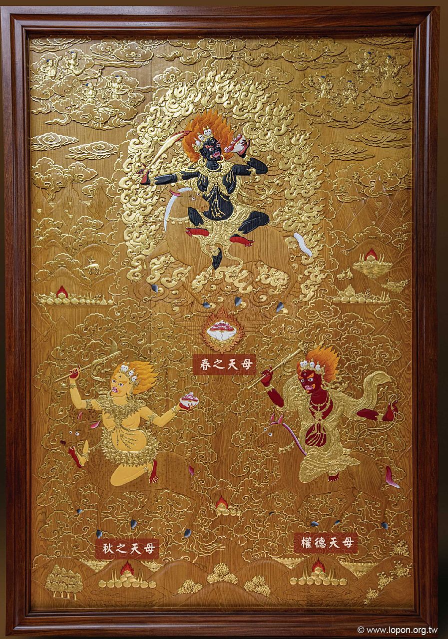 中央春之天母(藏文譯音:季吉嘉莫),右手執金剛刀,左捧盈血噶巴拉,騎白騾。 秋之天母(敦吉嘉莫)右手持鐮刀,左捧盈血噶巴拉,騎鹿。 權德天母(旺吉拉莫)右手持金剛鉤,左持金剛索,騎紅騾。