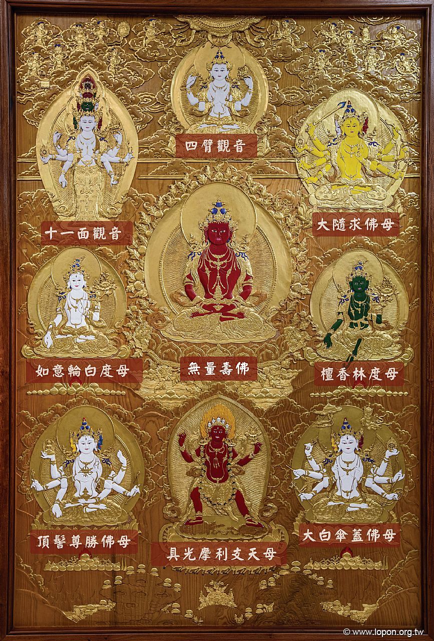 無量壽佛、具光摩利支天母、頂髻尊勝佛母、四臂觀音、如意輪 白度母、十一面觀音、大隨求佛母、檀香林度母、大白傘蓋佛母