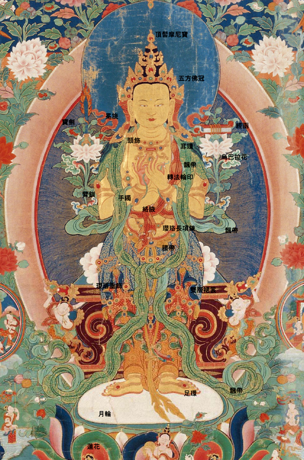 《佛說造像量度經解》(清,工布查布譯并解述)則記載:「五部等報身佛相,以八件寶飾為莊嚴。何者為八件:一、寶冠,即五佛冠也。二、耳環。三、項圈。四、大瓔珞。五、手釧及手鐲。六、脚鐲。七、珍珠絡腋。八、寶帶也。謂之大飾。耳垂上前臨優波羅華,冠左右下垂寶帶,脚鐲上圍繞碎鈴戒指等,謂之小飾。隨宜妙繒。雲肩飄繙為上衣,雜色長短重裙為下裳。」