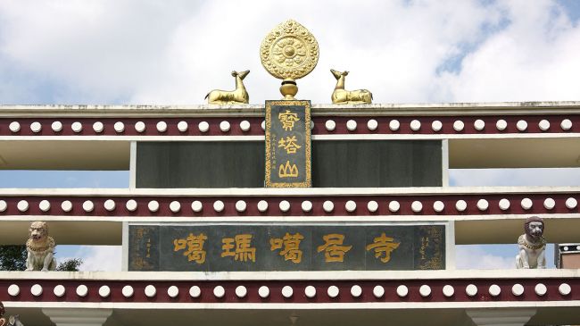 噶瑪噶居寺山門大氣雍容,是朝聖的起點,轉心向道的開始。這座牌坊式建築,以三層平台的結構,代表佛教三乘法門:小乘、大乘、金剛乘。