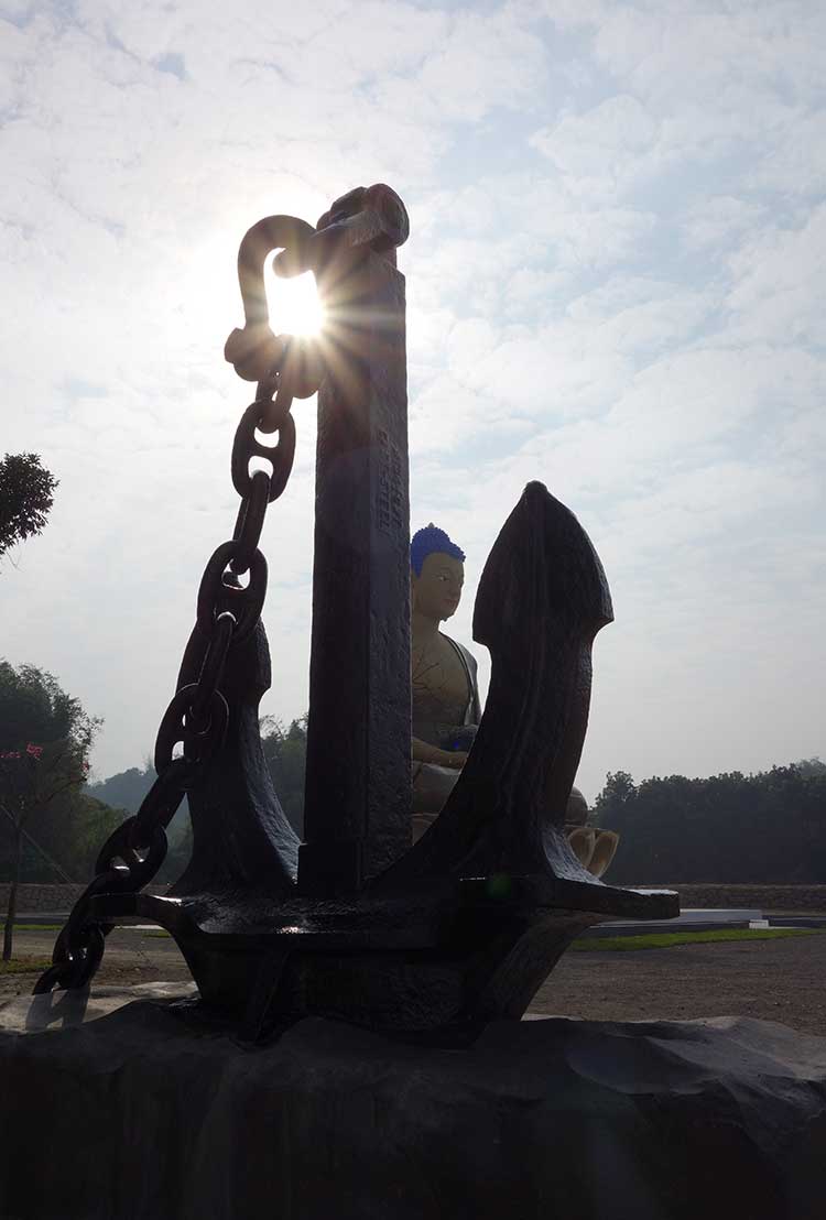左方法舟定錨,一艘歐洲客輪,縱橫海洋六十春秋,在台灣拆解歸空,船錨永固於此,泊靠於舍利塔左側,與六字大明鐘等齊。
