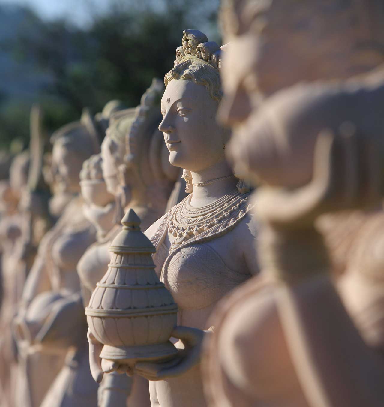 在天寬地闊、綠林圍繞之中,巍峨巨像震撼視覺,宛如從西天飛來,阿彌陀佛化身在此!願娑婆世界,無有紛爭。大佛前有四臂觀世音菩薩、金剛手菩薩及二十四尊供養天神女,是來自印度歐里莎,一個傳承千年,具有高度石雕技藝的小山城。每尊俐落的流線刻劃出輕薄細膩的服裝,顯現出每個動作的力與美。 請靜下心來欣賞雕像沈靜自在的表情,將會感受到石頭內的靈魂,正訴說著千年的傳奇。