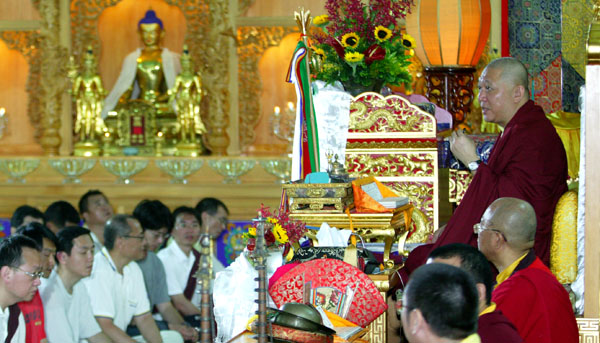 一連七天的浴佛暨財神寶瓶大法會,於今宣布吉祥圓滿。承蒙歷年來所有噶瑪寺弟子、金剛昆仲以及隨喜的信眾們,大家鼎力護持、不棄不離,所匯聚的力量,已昇華為永恆的功德莊嚴,與佛同在。 噶瑪寺開山二十二年後的今天,我們得到鄉親的認同及佈施,這一切都來自諸佛菩薩的感召。我謹代表噶瑪噶居寺,上至傳承祖師,下至一切追隨信眾,向左鎮的鄉親致上十二萬分的敬意與謝意,相信在這善因緣之下,我們必能將如來事業弘揚光大。 心存正念 莊嚴密續 對台灣而言,傳承千年的藏傳佛教是新興的。藏傳佛教在台灣的根基尚未穩固,很多人對密續還存有許多誤解而無法接受。尤其近幾年來,不法份子假借上師仁波切之名,行招搖撞騙之實,如是宗教事件時有所聞,更添負面影響。台南有個團體,蒐集了十幾二十年來,報刊雜誌上關於藏傳佛教的醜陋傳聞,別有用心的集結成冊,且大為廣量發行。對此現象,我個人並不感到訝異。如果真的所行非法,就不要害怕別人批評。一粒老鼠屎雖能弄壞一鍋粥,但不是所有的藏傳佛教都如同這些事件一樣。神聖的佛法不容毀謗,也絕對禁得起檢驗。 殊勝密續,嚴謹且莊嚴;然而,並非所有眾生都是修習密續的根基。因此許多門外漢乃至於佛教徒,在未能領受密續的見地之前,妄以個人邪知邪見,將灌頂視為一種能量的傳遞;將藏密雙運甚深內義,視為欲界淫慾的手段,嚴重誤導了眾生!在此,我要特別呼籲,提醒所有追隨藏傳佛教的信徒們,縱然有人批評我們西藏佛法是邪教,毀謗藏密為邪魔歪道,然而,各位仍要心存慈悲,秉持正念。 慈悲佈施,方能與財神法相應 每個人的因緣不同,所能相應的法門也不一樣。諸位務必以正確的發心動機學習藏密,千萬不要心存僥倖,把甚深的佛法,當作個人謀財的工具。本寺七年來,為台灣、為世界、為真正護持藏傳佛教的信眾們,啟修藏密獨有的財神寶瓶法會;然而,如此殊勝的財神法門,不是要幫大家快速致富,而是經由神聖的佛法告訴我們:接受藏密見地,乃至護持、成辦殊勝的財神法會,最重要的內涵是──所有參與的人都期許自己如財神般富有,而廣為照顧需要照顧的一切眾生。 諸位進入本寺如來殿之前,站在迎賓石上,右邊是世界生成圖。圖中央所表現的是宇宙,四方分別有白度母,給予眾生無量壽與健康;財神,給予眾生財富,令此世界眾生不因貧窮而受苦;手持高樑的地母,則代表萬物繁茂興盛;上樂金剛,賜予解脫成就,乃證悟菩提之根本。所以,向財神祈求並沒有罪過,若有染污,是自己的動機不清淨。 行大乘菩薩道,以佈施為首要;所謂的財施、法施、無畏施。佈施能破除吝嗇與貪心。佈施,是願將自己一切所有,乃至於國家、妻子、抑或親王之尊榮、自己的手足頭目腦髓……,只要眾生有需要,皆可布施。最後圓滿的佈施,是連這個身體都不執著,可供養給眾生。但在未證得空性之前,「捨身供養佈施」,是不被鼓勵的。 一般大眾,對於金錢上的佈施較容易辦到。然而,佈施的同時,內心是不是有所求?是否尚有不捨?這些課題,則是金剛乘弟子所要面對與反省的。能夠無為的、不吝嗇、沒有保留的,將己身所擁有,即便是身體也能一併佈施給予眾生──所謂具足殊勝的涅槃之道,乃由佈施所成就。圓滿的佈施,最終能獲證菩提。 如何成就七淨財? 現代人大都心靈空虛;無論富不富有,真正懂得佈施的人,內心常享豐足喜樂。佈施能夠斷離貧窮,獲得七種清淨財富。 學習佛法,效法菩薩之道,不是為此生而求,而是為解脫而修。解脫生死輪迴的重要,雖然許多人都了解,卻仍深愛這個五濁惡世,如同磁石吸到鐵片般,對輪迴有著難以割捨的執著。佈施正可以幫助我們,減少對世間的執著;尤其圓滿受持居士五戒,且力行布施,將能成就七種淨財──清淨信心、佈施、持戒、樂聞佛法、具有智慧、知慚、知愧。 知慚知愧 清淨懷疑 「知慚知愧」,尤為這個時代的人所欠缺。功勞都往自身攬,過錯盡往他人推。儼然已進入欺瞞的時代,君不君、臣不臣、父不父、子不子,即使夫妻之間,也經常需要謊言欺瞞,以維持家庭關係。孩子也會經常欺瞞父母,同樣的,父母也會欺瞞孩子。學校老師也教導學生「督學來了,要把參考書收起來。」看到諸多社會事件發生,於是教導我們的孩子不要跟陌生人講話,不要相信陌生人給的糖果……雖是防範未然,但這樣的氛圍,對孩子的成長,以及對他將來是不是真有幫助?懷疑不信任,似乎變成生存於現代必須學會的;然而,這些對修行而言,卻是需要清淨的! 領受加持的關鍵 以清淨的動機參與法會,而且了解法的珍貴與殊勝,方能獲得真正的法益與加持。若不了解,就像小孩不識鑽石的珍貴,而誤以為玻璃珠。同樣地,若對藏密未深入了解、且不具信心,則再大的加持也無法獲得些許。 一座寶瓶等於聚集一切財富的壇城。寶瓶之內具足上師、本尊、空行、護法;寶瓶所在之處,能帶給我們健康平安與幸福。也許有人質疑,某某人不是也有寶瓶嗎?可是他際遇並不好啊,也生病,事業也做垮了……雖是大家眼見的事實,但獲得加持的關鍵在於──擁有寶瓶,是否也持有清淨的三昧耶戒?動機是否清淨?若擁有寶瓶,動機卻不清淨,三昧耶戒也破了,那麼寶瓶的加持,如何獲得呢?即使每天給你無量甘露,承接的器皿破損,則無法持有。所以,不要被自己的眼睛蒙蔽了。即便自己擁有寶瓶,仍不健康、財富匱乏,也要心存感恩,因為