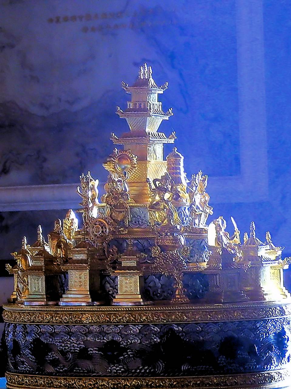有幸晉塔者象徵性的在轉生台上暫放,親人雙手合十,向克里希納祈禱;天香閣播放的音樂,正符合美妙的笛聲,心不生分別的向故人祈禱,這裡、此刻起直至成佛為止就是你的淨土。安心接受轉生,如是種下善因...